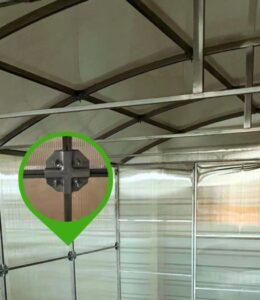 Od dołu konstrukcja szklarni jest wyposażona w ramę metalową, do której podczas montażu wchodzą łuki. Oprócz ramy od dołu, szklarnia Hestia wyposażona w profile poprzeczne o przekroju 40×20 mm, 4 rzędy poprzeczek na dachu oraz narożny ocynkowany profil z blachy, który montujemy na styku dachu i ścian.